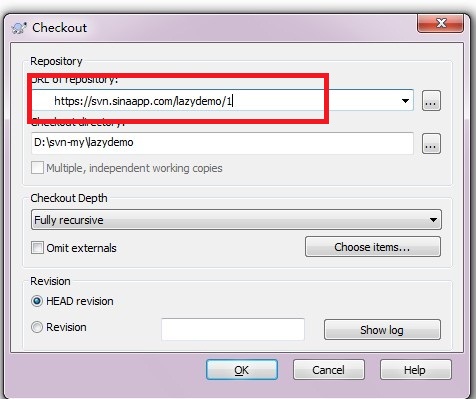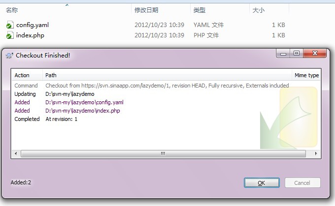 注意:URL of repository 寫 https://svn.sinaapp.com/lazydemo/1 lazydemo換成你的應用名,例如你的叫myappsae,那你就寫https://svn.sinaapp.com/myappsae/1 ,1是你創(chuàng)建的版本號,要不是創(chuàng)建的版本1就換成其他的數(shù)字。接下來會讓你輸入用戶名密碼,注意,這里的用戶名密碼不是微博的用戶名密碼,而是你在創(chuàng)建sae賬號時填寫的用戶名密碼。檢出后的代碼是: