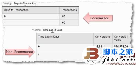 如果我們的是非電子商務(wù)網(wǎng)站,那么通過Google Analytics多渠道路徑(Multi-Channel Funnel),查看“Time Lag”報告,可以獲得許多驚人欣喜的結(jié)果。電子商務(wù)網(wǎng)站同樣可以查看數(shù)據(jù)“購買前所耗天數(shù)(Days to Transaction)”。我們即刻看到的度量是“轉(zhuǎn)化(Conversions)”,它反映了具體目標的轉(zhuǎn)化情況。