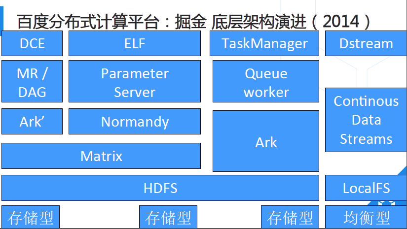 2014年,BML機(jī)器學(xué)習(xí)執(zhí)行引擎遷移到ELF第三代并行計算框架, ELF采用ParameterServer架構(gòu),大幅降低機(jī)器學(xué)習(xí)算法開發(fā)代價,對比于百度的第二代框架DVCE,在開發(fā)效率方面有大幅度的提升。離線計算方面,完成了Native C++ DAG引擎上線,百度內(nèi)部叫DCE(Distributed ComputingEngine)。