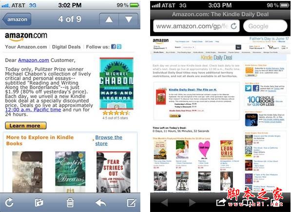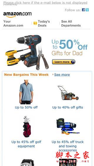 父親節(jié)即將來(lái)臨,很多在線商店都向消費(fèi)者發(fā)送了節(jié)日促銷郵件。下圖是來(lái)自亞馬遜的促銷郵件,它符合了方便手機(jī)閱讀的兩個(gè)要素:產(chǎn)品列表為瘦長(zhǎng)型,480px的寬度適合手機(jī)屏幕尺寸;白色底更好地凸顯了產(chǎn)品圖片以及文字和鏈接,讓人一目了然。