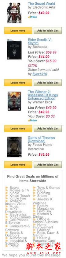 郵件內(nèi)容為320px寬,網(wǎng)頁(yè)鏈接清晰可見(jiàn),很容易促使消費(fèi)者點(diǎn)擊查看購(gòu)物車,從而刺激消費(fèi)。底端的商品列表無(wú)論是在電腦還是手機(jī)上都幾乎不會(huì)有人去一一點(diǎn)擊查看,亞馬遜選擇在列表頂端給出一個(gè)大的黃色按鈕,方便用戶點(diǎn)擊。