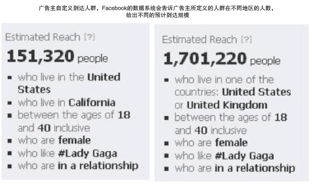 以LadyGaGa為例來做簡單的說明:在美國加州喜歡LadyGaGa的女性約有15萬人,而加入英國以后,喜歡LadyGaGa的女性人數(shù)大幅增加到近2百多萬人。如此一來,如果廣告商想針對喜歡LadyGaGa這類表演或歌手的受眾打廣告時(shí),對于受眾群的人數(shù)就有了大概的了解。假設(shè)產(chǎn)品是能量飲品(類似紅牛一類的飲品)的話,還可以進(jìn)一步針對喜歡運(yùn)動(#sport)和冒險(xiǎn)(#adventure)的Facebook用戶,甚至將紅牛等能量飲品的粉絲頁設(shè)定為受眾條件。