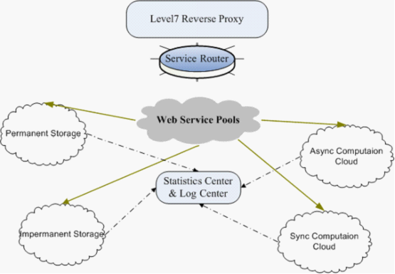 SAE從架構(gòu)上采用分層設(shè)計(jì),從上往下分別為反向代理層、路由邏輯層、Web計(jì)算服務(wù)池。而從Web計(jì)算服務(wù)層延伸出SAE附屬的分布式計(jì)算型服務(wù)和分布式存儲(chǔ)型服務(wù),具體又分成同步計(jì)算型服務(wù)、異步計(jì)算型服務(wù)、持久化存儲(chǔ)服務(wù)、非持久化存儲(chǔ)服務(wù)。各種服務(wù)統(tǒng)一向日志和統(tǒng)計(jì)中心匯報(bào),參考下圖: