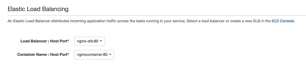 要配置負(fù)載均衡,我們首先需要在EC2的面板中創(chuàng)建一個(gè)ELB。然后重新創(chuàng)建服務(wù),在服務(wù)創(chuàng)建的過程中將ELB添加進(jìn)來,如下面截圖所示: