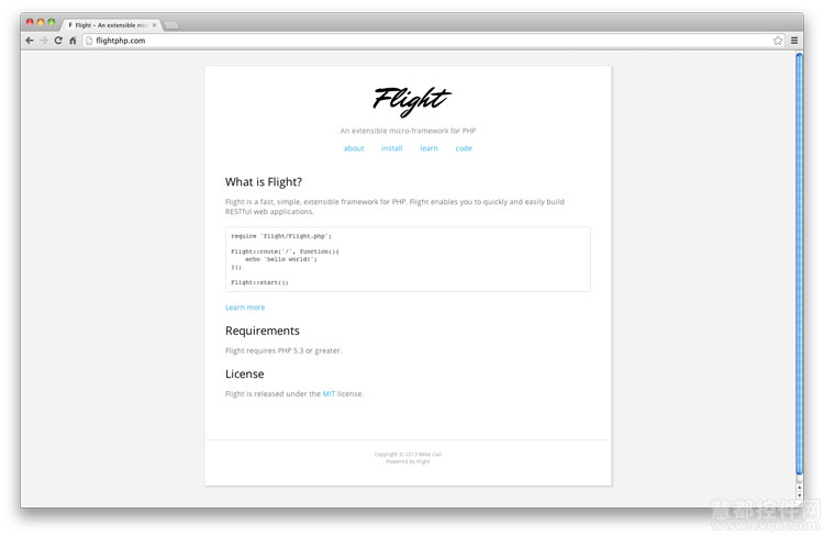 Flight是一個快速、簡單、可擴展的微型PHP框架,允許用戶快速的構(gòu)建Restful Web應(yīng)用程序,同樣易于學(xué)習(xí)和使用,簡單但是很強大!