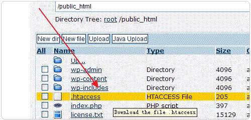 7、在你的空間的根目錄,找到.htacccess文件,可以用在線文件管理或者用FTP軟件將.htacccess文件下載到本地進(jìn)行編輯,都可以,如下圖: