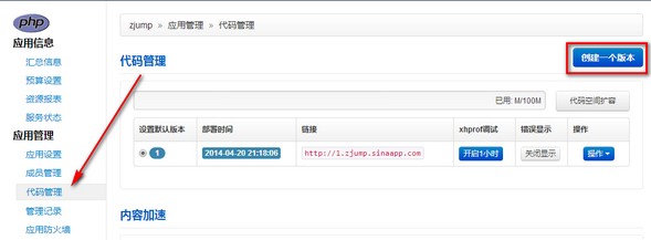 四、創(chuàng)建成功后,點(diǎn)擊該應(yīng)用進(jìn)行管理。點(diǎn)擊左側(cè)代碼管理,然后創(chuàng)建一個(gè)新版本,如版本1