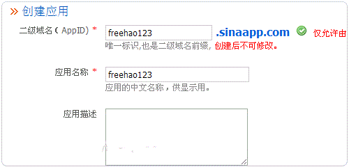 2、然后填寫你的應(yīng)用基本信息,其中那個(gè)二級(jí)域名非常重要,這是你以后個(gè)人空間的訪問地址,如下圖: