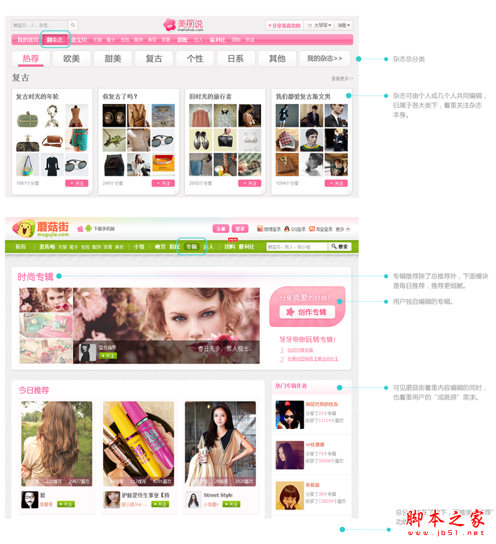 換湯不換藥,美麗說(shuō)的雜志和蘑菇街的專輯也同樣是用戶制作內(nèi)容的主要途徑之一。