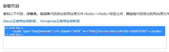 五、設(shè)置完畢后,保存并獲取代碼,接下來(lái)進(jìn)行非常重要的步驟了。將代碼添加到指定位置。浮窗類(lèi)、亮詞類(lèi)代碼添加到網(wǎng)站源文件<body></body>標(biāo)簽之間,固定位代碼添加到網(wǎng)站源文件相應(yīng)位置處。