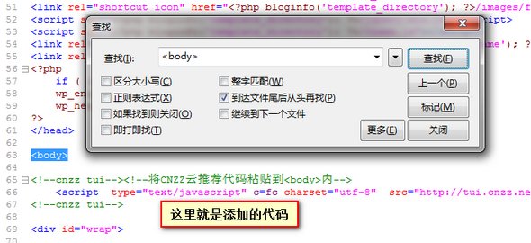 六、因?yàn)樾博客使用的WordPress,所以這里就提供wordpress的設(shè)置方法了。如果你是浮窗類(lèi)或者量詞類(lèi)代碼,在你的主題目錄找到header.php文件,然后搜索<body>,將代碼添加到<body>內(nèi)即可。
