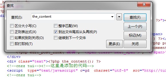 七、如果你是使用的固定位代碼,那么找到主題下的single.php文件,查找”the_content”,然后將代碼添加到下面。截圖如下: