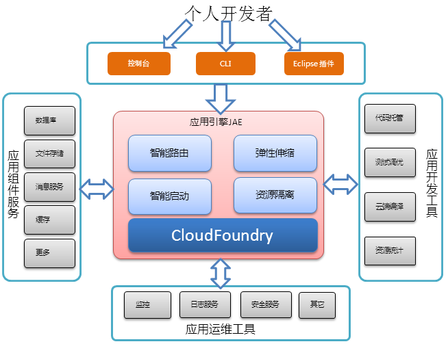 京東PaaS平臺的核心是JAE(Jingdong App Engine),它以Cloud Foundry為內(nèi)核,之所以選擇Cloud Foundry,是因為Cloud Foundry是最早開源,在社區(qū)里最成熟、最活躍的基礎(chǔ)PaaS平臺。為了給開發(fā)者提供更加便捷的服務(wù),JAE將基礎(chǔ)服務(wù)云化,接入各種應(yīng)用組件服務(wù),諸如高可用MySQL服務(wù)、Redis緩存集群服務(wù)、以及消息隊列等;此外,它結(jié)合應(yīng)用開發(fā)工具,為開發(fā)者提供了類github的代碼托管服務(wù),云測試和Java工程云端編譯,以及資源統(tǒng)計信息,讓開發(fā)者可以更專注于自己的代碼業(yè)務(wù)。再者,JAE對托管在平臺上的應(yīng)用進行健康監(jiān)控,支持查看應(yīng)用日志,提供其它安全服務(wù)。讓開發(fā)者只需關(guān)心自己應(yīng)用代碼,而其它一切事情,都由JAE為其提供,極大地提高了開發(fā)者的效率,降低了開發(fā)成本。下圖描述了JAE與PaaS平臺用戶及其他相關(guān)服務(wù)之間的關(guān)系。