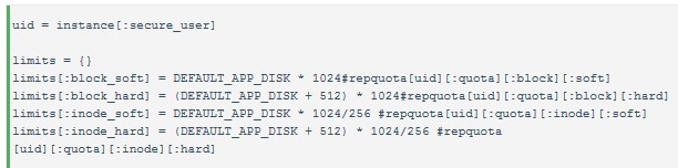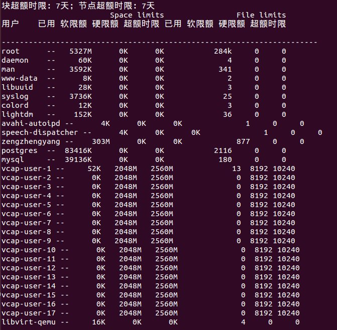 當(dāng)部署一個應(yīng)用實例時,quota設(shè)置磁盤配額。上面vcap safemode提到,每個實例都分配一個用戶,而quota就是對此用戶的配額管理。Quota管理blocks和inodes有hard和soft兩個臨界點,超過soft值,可允許繼續(xù)使用,若超過hard值,就不再允許寫入操作了。