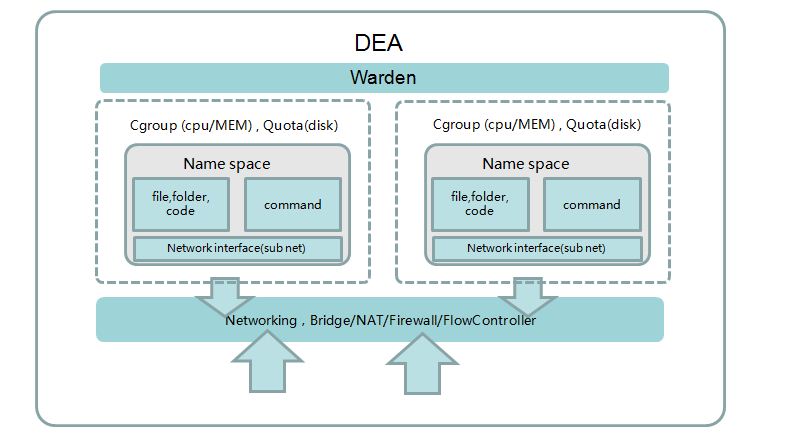 Cloud Foundry用warden來實現(xiàn)資源隔離與訪問控制的,但是JAE的第一個版資源隔離策略使用了vcap dev,當(dāng)時沒有warden。在當(dāng)時的背景下,Cloud Foundry官網(wǎng)還未遷移至v2版、業(yè)內(nèi)的成功應(yīng)用也比較少, JAE采取穩(wěn)中求進的方案,即在vcap dev的基礎(chǔ)上,借鑒了warden思路,以此來實現(xiàn)資源隔離和訪問控制。下面,我們將詳細介紹JAE的第一版資源隔離實現(xiàn)方法,該方法部署起來所需的資源比較靈活,既支持單機部署也支持多機部署,對個人開發(fā)者有很好的借鑒參考。
