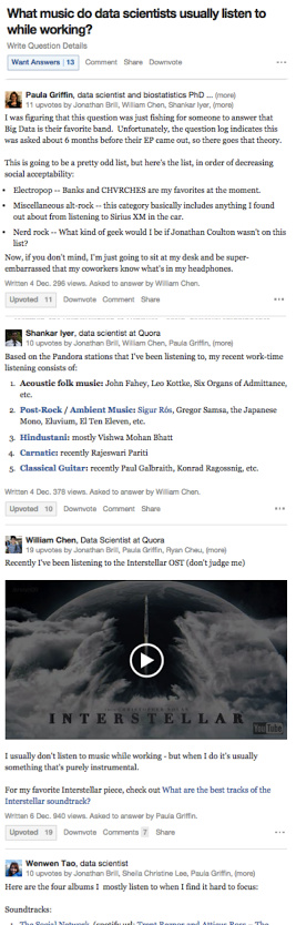 在Quora, 還有很多其他的排名應(yīng)用,有些甚至不為人察覺(jué)。例如,對(duì)于一個(gè)答案點(diǎn)贊的用戶名也是排序后顯示的,目的是要將我們認(rèn)為對(duì)于該問(wèn)題/答案最有見(jiàn)識(shí)的用戶排在最前。同樣,對(duì)于特定問(wèn)題顯示可能的回答者時(shí),那些推薦的用戶也是排過(guò)序的。