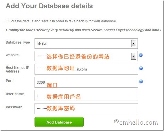 數(shù)據(jù)庫備份當(dāng)然也要填寫數(shù)據(jù)庫信息,并且設(shè)置備份周期啦。需要注意的是,這里備份的數(shù)據(jù)庫貌似必須是你上面已經(jīng)提交的那個網(wǎng)站哦,其他的也不知道行不行,倡萌沒測試。