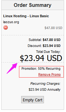 這里我選擇一年的,然后我們需要在右側看到訂單購物車,輸入優(yōu)惠碼"Dudrop2015 "享受半價。