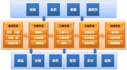 二級系統(tǒng)則包括商品信息系統(tǒng)、訂單系統(tǒng)、ERP、倉儲系統(tǒng)、物流與干線運輸系統(tǒng)等。