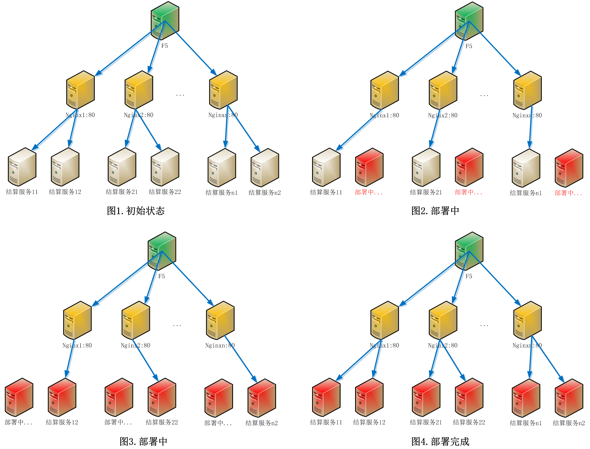 借助了Nginx在運行狀態(tài)下可以reload配置,而基本不影響對外提供服務(wù)的能力。每個Nginx負(fù)載兩臺應(yīng)用服務(wù)器,灰度發(fā)布時,將Nginx配置更改為只負(fù)載一臺應(yīng)用服務(wù)器,即可對另一臺進行部署。用戶請求不會導(dǎo)向正在部署中的服務(wù)器,從而不影響用戶下單。