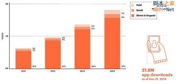 這張圖表顯示Etsy的大部分瀏覽量來自于有機營銷渠道,而且4年來一直維持著這個趨勢,付費廣告帶來的訪問只占到2-7%。