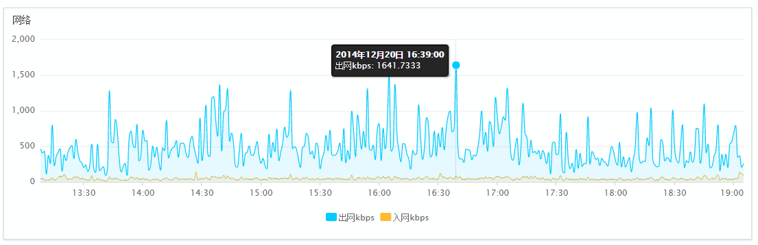 從圖中可以看到最大的出網(wǎng)速率為 1641 kbps,其中 1M = 1024 kbps,2M = 2048 kbps ,可以看出,這個 1641 kbps 在 1M 和 2M 之間,那么,我們就要購買至少 2M 帶寬啦!