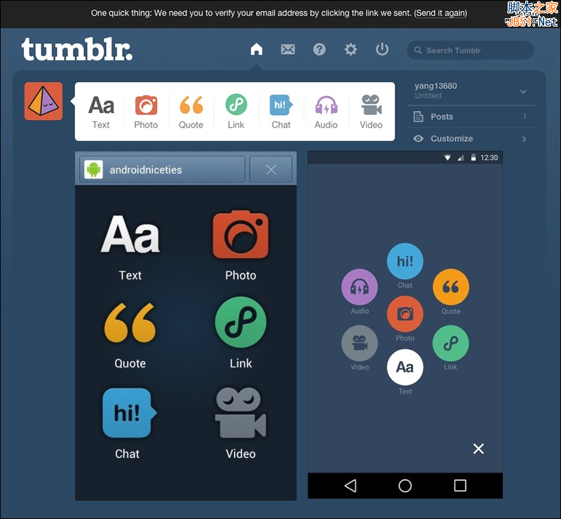 在實際的設(shè)計運用中,常會用些更綜合的手法,例如整體有主導(dǎo) 色調(diào),小范圍布局會采用同色調(diào)搭配。拿tumblr的發(fā)布模塊來說,雖然頁面有自己的主色調(diào),但小模塊使用同色調(diào)不同色彩的功能按鈕,結(jié)合色相變化和圖形表達不同的功能點,眾多的按鈕放在一起,由于同色調(diào)原因模塊非常穩(wěn)定統(tǒng)一。