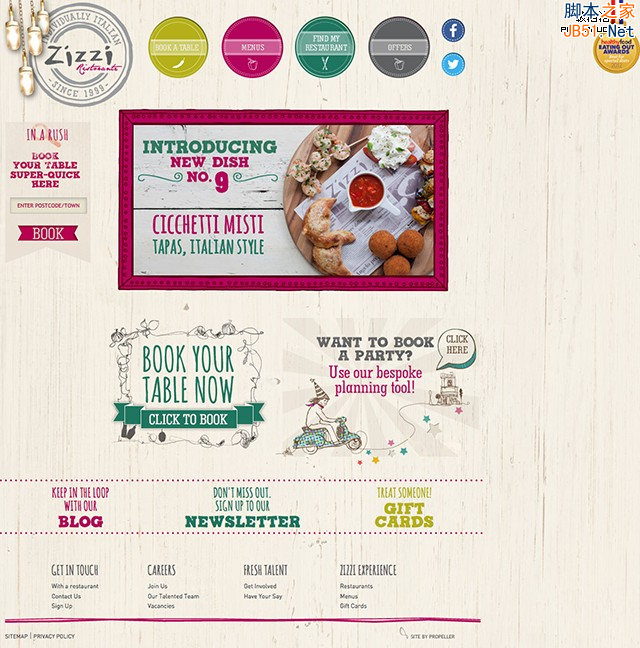 5、Zizzi Ristorante的網(wǎng)站第一眼可能會(huì)覺得有些凌亂,但用戶的視線最終還是會(huì)聚集到枚紅色框內(nèi)的內(nèi)容上。單從布局上來說,這個(gè)網(wǎng)站并沒有什么過人之處,但仔細(xì)一看,我們不難發(fā)現(xiàn)其實(shí)網(wǎng)站中圖片的占比很少,按照常規(guī)的做法,頁(yè)面會(huì)變得很單調(diào),因此,設(shè)計(jì)師最后用一些色塊或是圖形巧妙地化解了這個(gè)不足,無形中完成了圖片與文字之間的完美合作。
