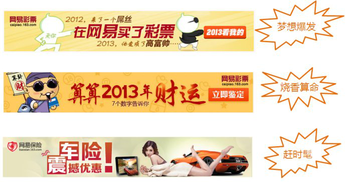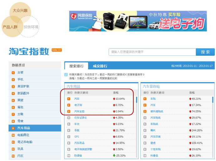 要做到大眾興趣和產(chǎn)品人群結(jié)合,其實(shí)就是找到產(chǎn)品的目標(biāo)人群對什么感興趣。去年做車險(xiǎn)素材時(shí),我們在淘寶指數(shù)上查到,在汽車用品中最受歡迎的關(guān)鍵詞分別為”汽車、電子狗、汽車坐墊”,因此當(dāng)時(shí)網(wǎng)易保險(xiǎn)就出了一個(gè)”買車險(xiǎn)送電子狗”的素材(如下圖)。這個(gè)素材在當(dāng)月同樣位置的所有素材中,效果是最好的。