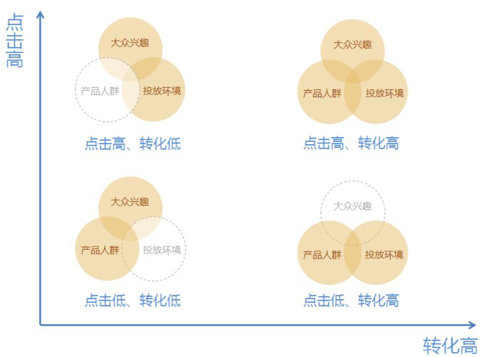 產(chǎn)品人群和投放位置的人群越匹配,效果自然就越好(如下圖)。為了讓大家更容易理解,下圖只是做個(gè)簡單示意。實(shí)際上很多情況是顯而易見的,不需要用這么復(fù)雜的方式。比如在女性頻道里投化妝品廣告,肯定比在軍事頻道里投化妝品廣告效果好。