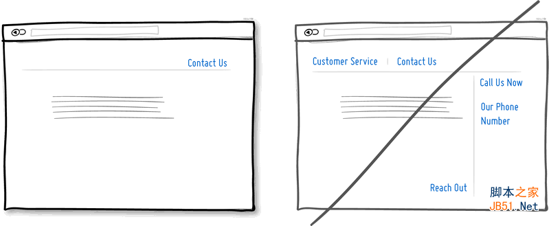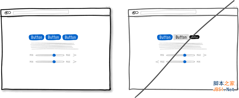 例如配色、層次、對比等視覺風(fēng)格要素可以幫助人們更好的理解和使用你的產(chǎn)品界面,讓他們知道自己現(xiàn)在在哪,接下來可以去哪。為了清晰的呈現(xiàn)這些信息,可點擊元素(鏈接、按鈕)以及可選擇項目(選項)、普通文字內(nèi)容的視覺風(fēng)格必須彼此形成顯著的差異,并且在全局范圍內(nèi)保持風(fēng)格的一致性。在下面的草圖范例中,我使用藍(lán)色來表示可點擊元素,黑色文字表示已選擇或當(dāng)前所在位置標(biāo)題。如果你能正確的使用視覺風(fēng)格,用戶將能更好的通過這些視覺線索瀏覽界面。絕不要讓這幾類視覺元素的呈現(xiàn)方式含糊不清,否則你就是在給用戶找麻煩。