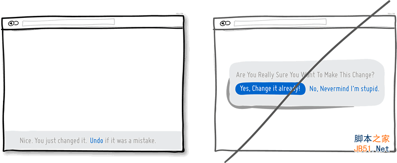 設(shè)想一下,你剛剛點擊了一個按鈕或鏈接。撤銷功能尊重人類的基本意圖,允許首先平滑的產(chǎn)生相應(yīng)的行為。而另一方面,彈出確認(rèn)的形式會質(zhì)疑用戶的意圖,致使用戶對自己要做的事情產(chǎn)生疑慮。我愿意假設(shè),多數(shù)時候,用戶的行為都符合自己的意圖,誤操作只是少數(shù)情況。當(dāng)用戶需要反復(fù)執(zhí)行某個行為的時候,低效、丑陋的彈出確認(rèn)就會一遍一遍的呈現(xiàn),非常不人性化。嘗試通過撤銷功能讓用戶感覺自己正在充分控制局面,盡量不要通過確認(rèn)來提出質(zhì)疑。