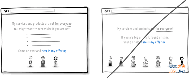 你的產(chǎn)品是面向所有人的還是精確的鎖定某類人群?直言產(chǎn)品和服務(wù)的目標(biāo)用戶類型,這也是提升轉(zhuǎn)化率的有效方式之一。通過對用戶資質(zhì)的描述,你可以更精確的與你的目標(biāo)用戶建立關(guān)聯(lián),而且會帶來一種“排他”的情感暗示。當(dāng)然,這種策略也有一定的風(fēng)險,你可能會將潛在用戶的范圍限定的過小。但是我們必須相信,透明可以帶來信任。