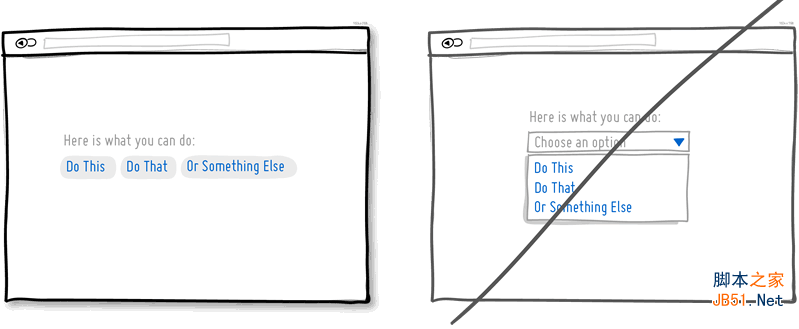 你每使用一個下拉菜單,就會隱藏掉一些行為選項,用戶就會需要多付出些力氣來找到它們。如果那些隱藏掉的選項是要被放置在用戶瀏覽內(nèi)容、完成決策的主要路徑上的,那么你也許應(yīng)該考慮一下將它們一覽無余的呈現(xiàn)出來。而對于那些可以預(yù)計的、無需學(xué)習(xí)成本的操作,例如選擇日期和時間,或地理位置設(shè)置等,仍可以保持下拉菜單的形式。有時,下拉菜單也可以適用于那些需要用戶反復(fù)執(zhí)行相同動作的界面;但如果某些操作是保證轉(zhuǎn)化率提升的主要Call to Action,在考慮下拉菜單的時候還是小心為妙。