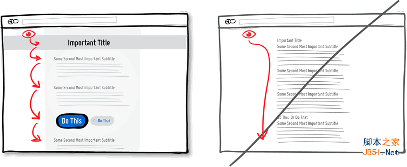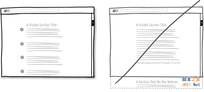 “內(nèi)容結(jié)束”的假象是轉(zhuǎn)化率的殺手。特別是在長頁面中那些段落分隔的地方,當(dāng)心不要讓用戶覺得內(nèi)容已經(jīng)結(jié)束掉了。試著確定一種視覺模式與節(jié)奏,讓用戶可以得到明確的指引,持續(xù)閱讀內(nèi)容。對于有可能出現(xiàn)在“折現(xiàn)”位置的留白或內(nèi)容間距,要確保它們的尺寸不會過大。