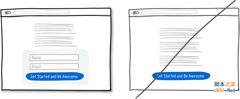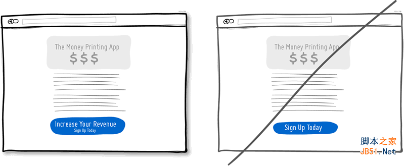 想象一個頁面中的兩個按鈕。一個寫著“幫你省錢”,一個要你“注冊”。我打賭點擊第一個按鈕的人會更多,因為一個孤零零的“注冊”難以展示產(chǎn)品的內(nèi)在價值?;蛘?,展示好處的內(nèi)容也可以放在距離Call to Action很近的地方,以便讓用戶知道為什么要去點擊按鈕。當(dāng)然,不是所有的按鈕都需要展示這樣的文案;那些任務(wù)驅(qū)動的“普通”按鈕更適于對轉(zhuǎn)化率沒有什么要求的環(huán)節(jié)當(dāng)中,或是需要用戶反復(fù)執(zhí)行的操作上。