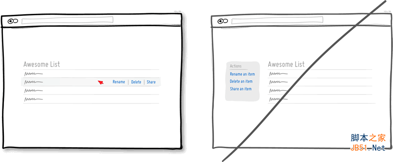 有時,可以讓某些特定的界面元素具有交互性,來觸發(fā)顯示相關(guān)的任務(wù)選項,而不是直接提供一系列關(guān)聯(lián)性不強(qiáng)的動作列表。例如,當(dāng)呈現(xiàn)一個數(shù)據(jù)列表時,我們通常需要允許用戶對每條數(shù)據(jù)進(jìn)行操作。你可以讓用戶通過鼠標(biāo)懸停使每個列表單元中的相關(guān)操作呈現(xiàn)出來(刪除、重命名等等)。另外一個關(guān)于直接操作的常見案例就是點擊數(shù)據(jù)條目本身(譬如一段地址信息),使其進(jìn)入編輯狀態(tài)。相比于無視上下文情境而直接展示各種操作選項,這種交互模式可以讓用戶更加聚焦于當(dāng)前的目標(biāo),減少界面復(fù)雜性和操作步驟。但要記住,對于一些較為常規(guī)的、情境化確實不強(qiáng)的普通操作來說,情境菜單仍有它的用處。