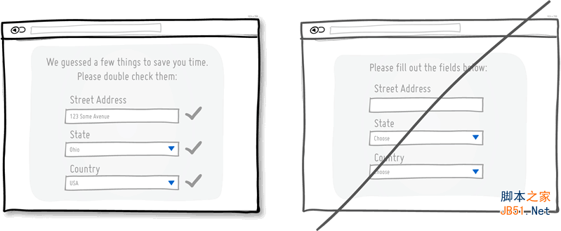 在表單字段中預(yù)先填寫合理的默認(rèn)值,這是一種幫助用戶盡快完成表單填寫的常見方式。最差勁的體驗之一,就是用戶曾經(jīng)填寫過某些數(shù)據(jù),而你還要他們重復(fù)這些動作。使用經(jīng)過調(diào)研驗證的恰當(dāng)數(shù)據(jù),或是曾經(jīng)保存過的用戶輸入內(nèi)容作為表單字段的默認(rèn)值,讓用戶少做些事情,多些輕松。