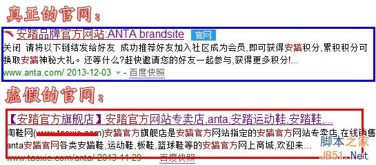 首先,商城網(wǎng)站需要注意了。很多商城網(wǎng)站的信息里都帶有“官網(wǎng)”,為了什么?為了就是讓用戶(hù)覺(jué)得這個(gè)商城網(wǎng)站更有權(quán)威和信任感,所以很多商城網(wǎng)站的信息里都帶有“官網(wǎng)”。比如安踏運(yùn)動(dòng)商品,安踏已經(jīng)有官網(wǎng)了,搜索安踏卻出現(xiàn)很多個(gè)官網(wǎng),用戶(hù)要選擇哪一個(gè)官網(wǎng)?如點(diǎn)擊第一個(gè)安踏官網(wǎng)發(fā)現(xiàn)不是真正的官網(wǎng),用戶(hù)會(huì)直接退出,如果點(diǎn)擊的第二個(gè)安踏官網(wǎng)發(fā)現(xiàn)是真正的官網(wǎng),那么用戶(hù)會(huì)覺(jué)得其他的官網(wǎng)沒(méi)有這個(gè)官網(wǎng)更有信任感,而對(duì)于百度搜索引擎來(lái)說(shuō),除了第二個(gè)是真正的安踏官網(wǎng),剩下的都是虛假官網(wǎng)。用戶(hù)也知道安踏的官網(wǎng)只有一個(gè),除非有第二個(gè)安踏公司,不然都是虛假的安踏官網(wǎng)。