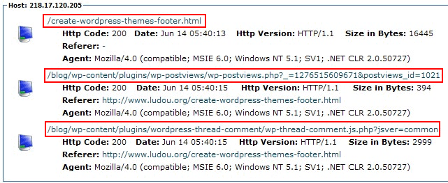 上圖中Host: 218.17.120.205 為訪客的IP,可看出該訪客在當前時間段發(fā)起了三個請求,對應原始訪問日志中的3行記錄,紅色標出的部分為訪客請求的資源(也就是訪客流量的網(wǎng)頁等),其他部分參見以上說明。“Latest Visitors”中只能顯示最近300個IP的訪問信息,這里我寫了一個原始訪問日志的格式化工具,可將原始訪問日志格式化成上圖所示格式,方便閱讀,工具地址:http://ludou.co.tv/logreader/