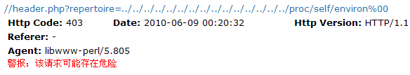 例如下圖的4個請求信息。/admin/editor/db/kmoxewebeditor.mdb等幾個資源都是不是本站的資源,所以Http Code不是403就是404,但從名稱分析,可能是保存數(shù)據(jù)庫信息的文件,如果這些信息讓別人拿走,那么攻擊你的網(wǎng)站就輕松多了。發(fā)起這些請求的目的無非就是掃描你的網(wǎng)站漏洞,通過漫無目的地掃描下載這些已知的漏洞文件,很可能會發(fā)現(xiàn)你的網(wǎng)站某個漏洞哦!通過觀察,可以發(fā)現(xiàn),這些請求所使用的Agent差不多都是Mozilla/4.0、Mozilla/5.0或者libwww-perl/等等非常規(guī)的瀏覽器類型,以上我提供的日志格式化工具已經(jīng)集成了對這些請求的警報功能。我們可以通過禁止這些Agent的訪問,來達到防止被掃描的目的,具體方法下面再介紹。