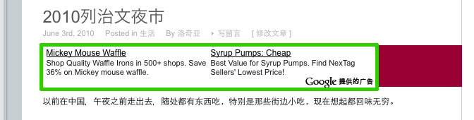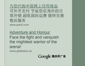 關(guān)于廣告的過濾,很多人聯(lián)想到平時上網(wǎng),用插件來過濾了一些網(wǎng)站的低俗廣告;我在這里說的廣告過濾是針對Google廣告的過濾。下面再次用我博客的一則廣告作為例子: