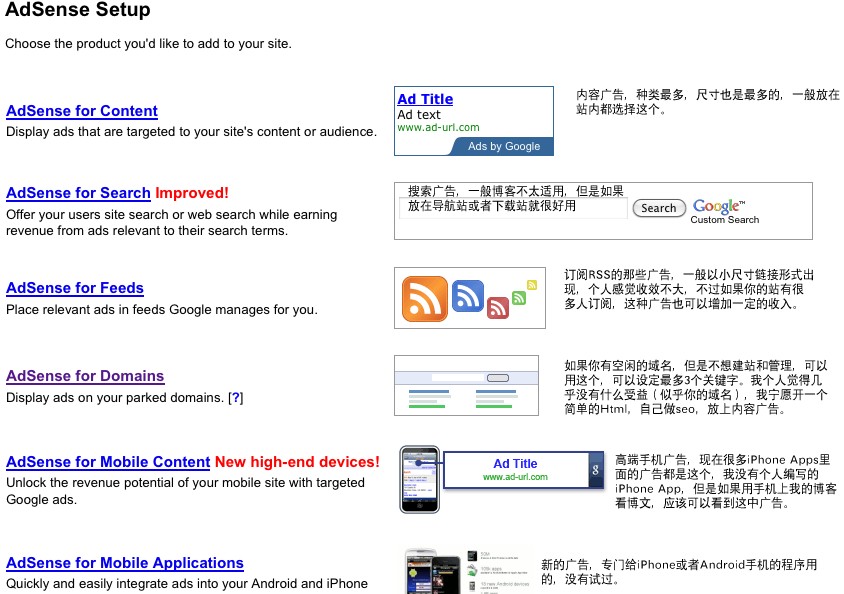 雖然很多時候洛奇亞我選擇的廣告都是”ad unit”里面的廣告,但是其實一個網(wǎng)站混合了不同種類的廣告是最好的,例如你可以在網(wǎng)站里面放有鏈接廣告(”link unit”),然后混合有文字和圖像的廣告,甚至加上一個搜索廣告,以達(dá)到最好的效果。當(dāng)然前提是不要影響網(wǎng)站的整體外觀,另外也要注意Google Adsense的條例,似乎在單一頁面里面是不應(yīng)該出現(xiàn)超過3個Google廣告的(包括搜索)。