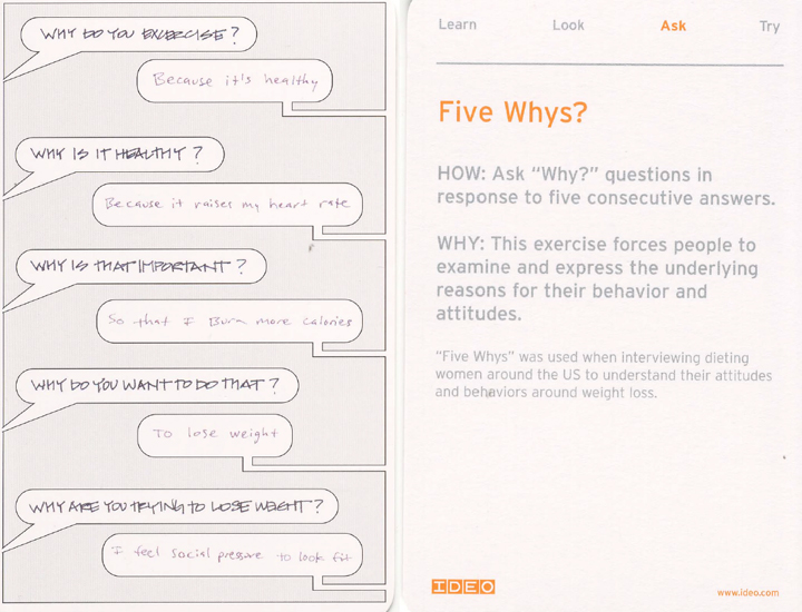 連續(xù)問用戶5個(gè)問題以獲得深度遞進(jìn)的答案,這個(gè)方法能有效的使用戶表達(dá)出深層的想法和原因。