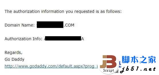 2、域名解鎖了后我們還要進(jìn)行另外一個(gè)操作,就是獲取域名轉(zhuǎn)移碼,點(diǎn)擊上圖中的鏈接,然后Godaddy會(huì)發(fā)送轉(zhuǎn)移碼到域名whois里面的郵箱。我們進(jìn)入相應(yīng)的郵箱會(huì)發(fā)現(xiàn)Godaddy發(fā)來的郵件,如下,里面有域名轉(zhuǎn)移碼
