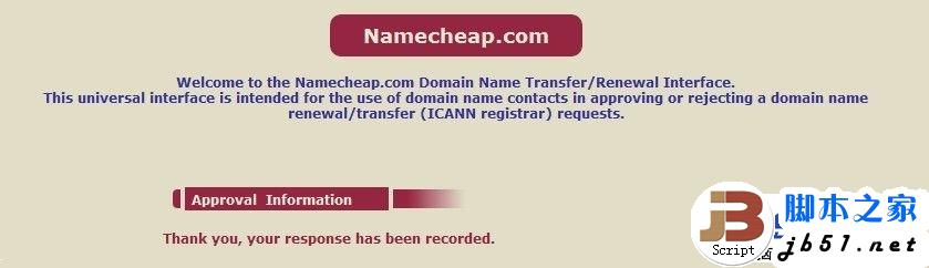 首先操作完以上步驟,然后相應(yīng)的郵箱會(huì)收到一封Namecheap域名確認(rèn)轉(zhuǎn)移郵件,點(diǎn)擊相應(yīng)的鏈接,會(huì)跳轉(zhuǎn)到如下界面,也就是需要確認(rèn)是否開始轉(zhuǎn)移,這時(shí)候我們直接選擇I Approve。然后點(diǎn)擊下面的SUBMIT就行了