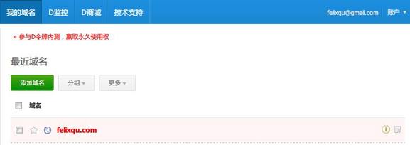 好吧,改域名的DNS吧,目前國(guó)內(nèi)提供免費(fèi)DNS服務(wù)的比較火的貌似就是DNSPOD。首先注冊(cè)DNSPOD,過(guò)程很簡(jiǎn)單,郵件驗(yàn)證和手機(jī)短信驗(yàn)證后就可以添加域名了。