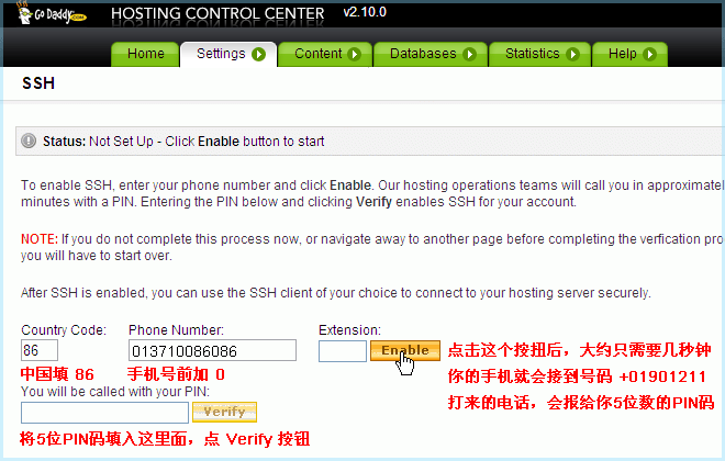 2、在開通設(shè)置頁面里,填寫你所在的國家區(qū)號和你的手機(jī)號碼,點擊 Enable 按鈕后,稍等幾秒鐘,你的手機(jī)就會接到號碼為 +01901211 的來電,你不用擔(dān)心自己英語不好,因為打來來電話的是電腦機(jī)器人,它會報給你5位PIN數(shù)字,會重復(fù)一遍,仔細(xì)聽好記好就OK了。報完后電話會自動掛斷, 你將聽到的5位PIN填入按 Verify 按鈕確認(rèn)。如下圖示: