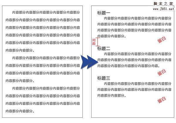 在編輯網(wǎng)站內(nèi)容時,大篇幅的內(nèi)容寫成幾個部分并標(biāo)上標(biāo)題,這樣用戶在閱讀時就能夠先閱讀標(biāo)題了解內(nèi)容,這樣用戶就不用費很多時間閱讀自己不需要的章節(jié)了。當(dāng)然,章節(jié)標(biāo)題的意義是為了概述一段文字,因此標(biāo)題需要仔細(xì)斟酌,切不可隨意的安放一句話就當(dāng)做標(biāo)題。另外,標(biāo)題與內(nèi)容要比其他的信息接近,當(dāng)標(biāo)題和上下的文字間距相同時,標(biāo)題就會“飄”在兩段文字間,讓用戶茫然。標(biāo)題和文字間應(yīng)當(dāng)使用緊湊原則來布局,這樣用戶就能準(zhǔn)確的知道標(biāo)題概述的是哪個部分的內(nèi)容。如圖: