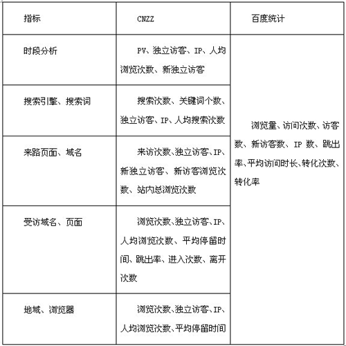 既然是統(tǒng)計系統(tǒng),當(dāng)然首先是看統(tǒng)計指標(biāo),其實基本的統(tǒng)計指標(biāo)大家都差不多(見表)。簡單的評價是:百度統(tǒng)計在統(tǒng)計指標(biāo)上比較嚴(yán)謹(jǐn)(嚴(yán)謹(jǐn)?shù)搅丝鋸埖牡夭?,CNZZ的不同指標(biāo)有一定針對性,但缺乏體系感。